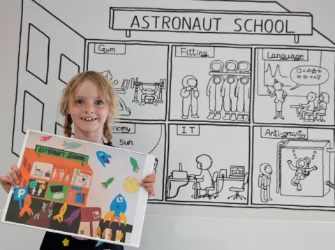 Ella, 9, with her astronaut school artwork in front of the mural in the new unit.