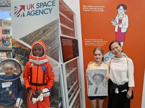 Children at the UK Space Agency event stall (left). Aimee holding her artwork and artist Kiriko Kubo in front of the Mary Jackson art feature (right).