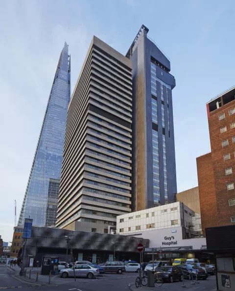 Refurbishing Guy’s Tower involved replacing every window, repairing damaged concrete, and applying 8,000m² of bespoke aluminium cladding to the outside of the 34-storey landmark building. Key aims also included improving energy efficiency and reducing carbon emissions.