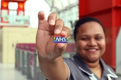 The badge is an NHS logo superimposed on the rainbow pride flag and can be worn on lanyards or uniforms. They promote a message of inclusion and are a sign that the wearer is someone you can talk to about issues of sexuality and gender identity.