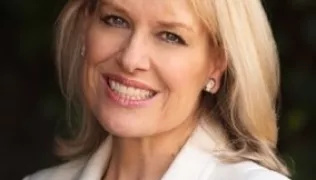 Sue Saville has long blonde hair and is wearing a white collared shirt